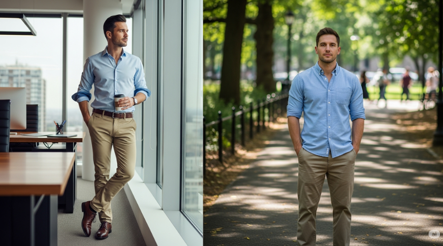 Đi làm văn phòng: Chỉ cần kết hợp quần kaki màu trung tính (đen, be, ghi) cùng áo sơ mi, bạn đã có ngay một set đồ lịch lãm.